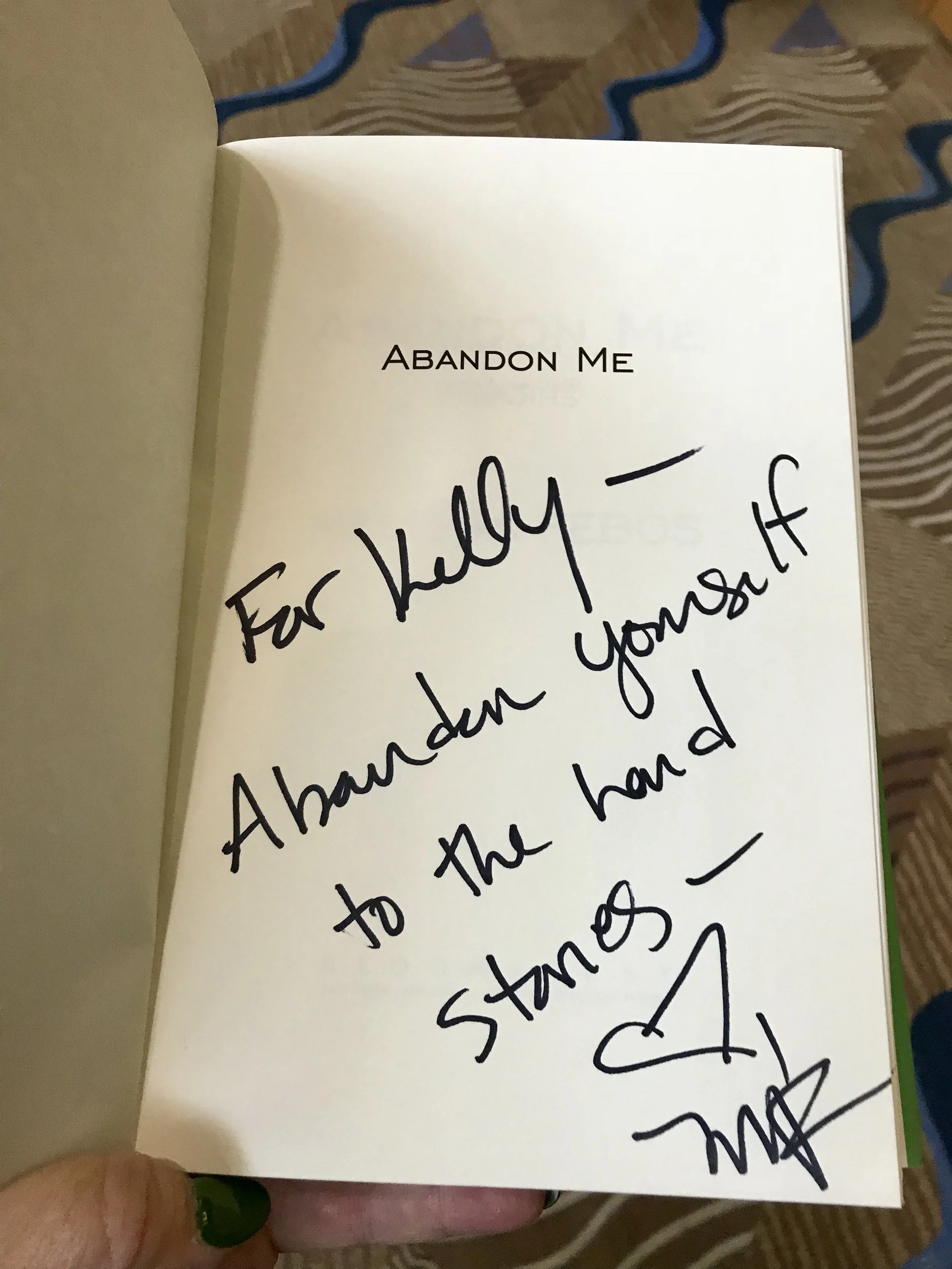 Melissa Febos signed my copy of her book Abandon Me. Her message reads, "For Kelly, abandon yourself to the hard stories."